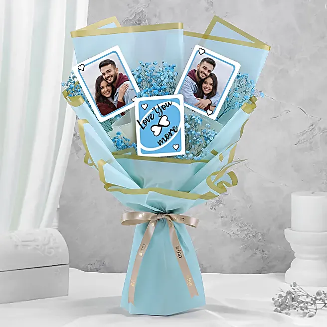 Make your loved ones feel extra special with this beautiful Personalized Photo Bouquet. Designed with your cherished memories, this bouquet combines elegance and emotions in one perfect gift. Featuring customized photos and a stylish blue wrapping, it’s a unique way to express love on special occasions.
